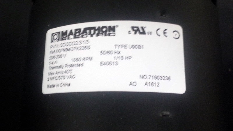 Manitowoc OEM NEW Fan motor, Manitowoc part number 2412939. This fan motor, made by Marathon Electric has a part number label of 000002315 and is 208-230v.
