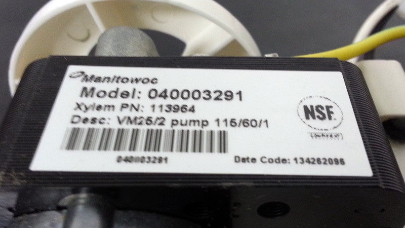 Manitowoc under counter NEO model ice machine pump, OEM part number 040003291. This is a 115v pump used exclusively on NEO model ice machines.